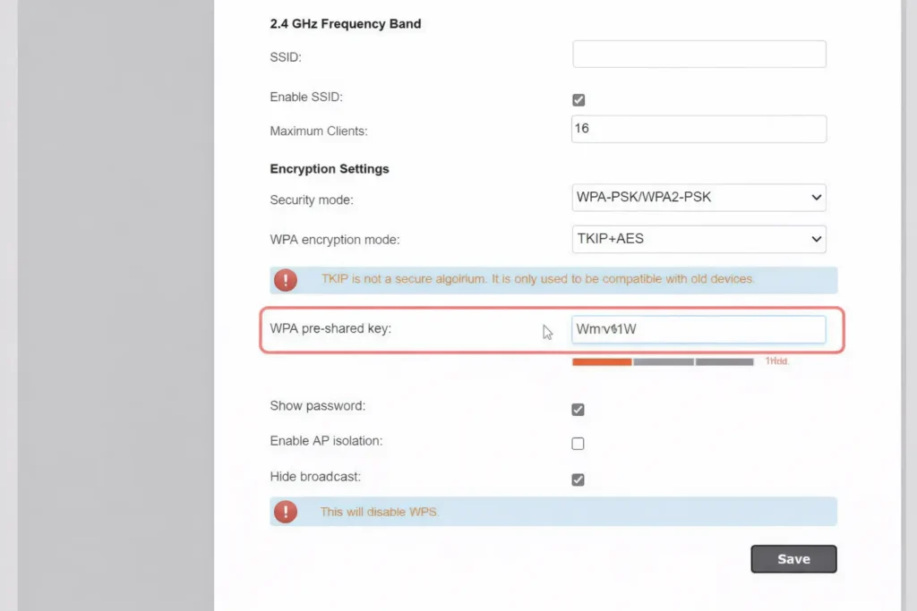 في هذه الصفحة ستجد الحقول الخاصة بالشبكة اللاسلكية مثل WPA (Wi-Fi Protected Access) أو Wi-Fi Key أو Password. ومن هنا يمكنك تغيير كلمة سر الواي فاي أو تعديل إعدادات الأمان الأخرى.